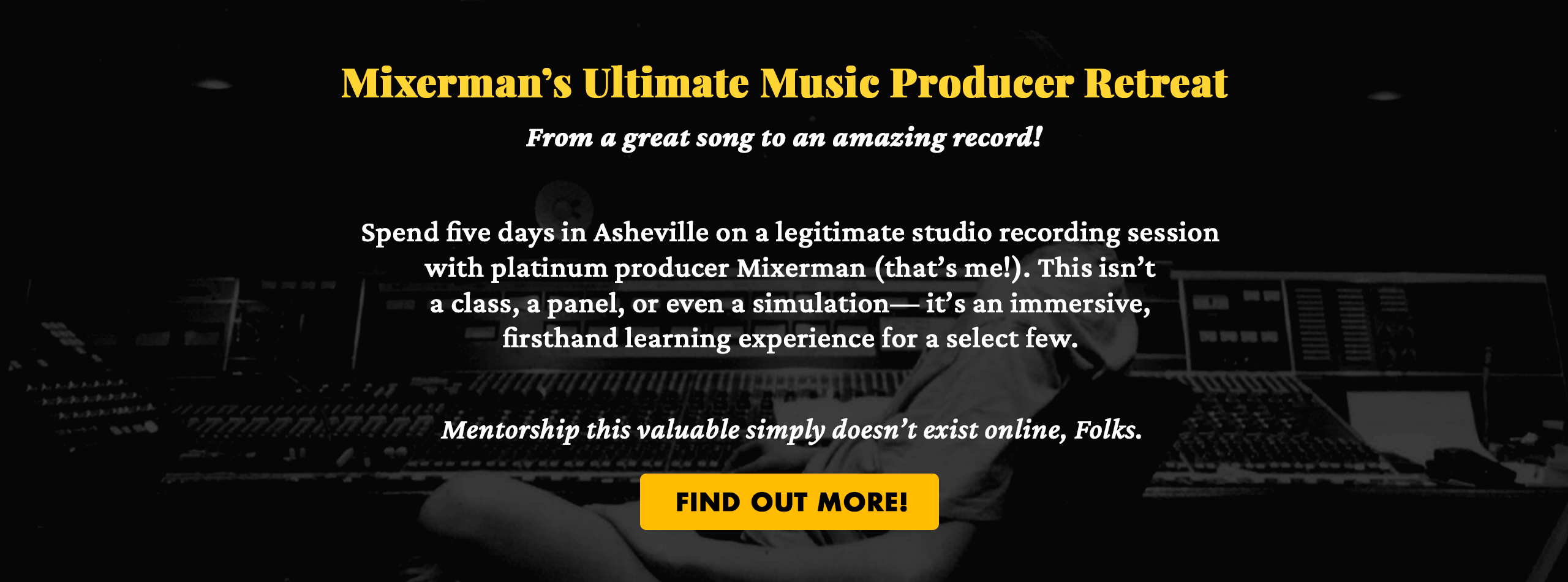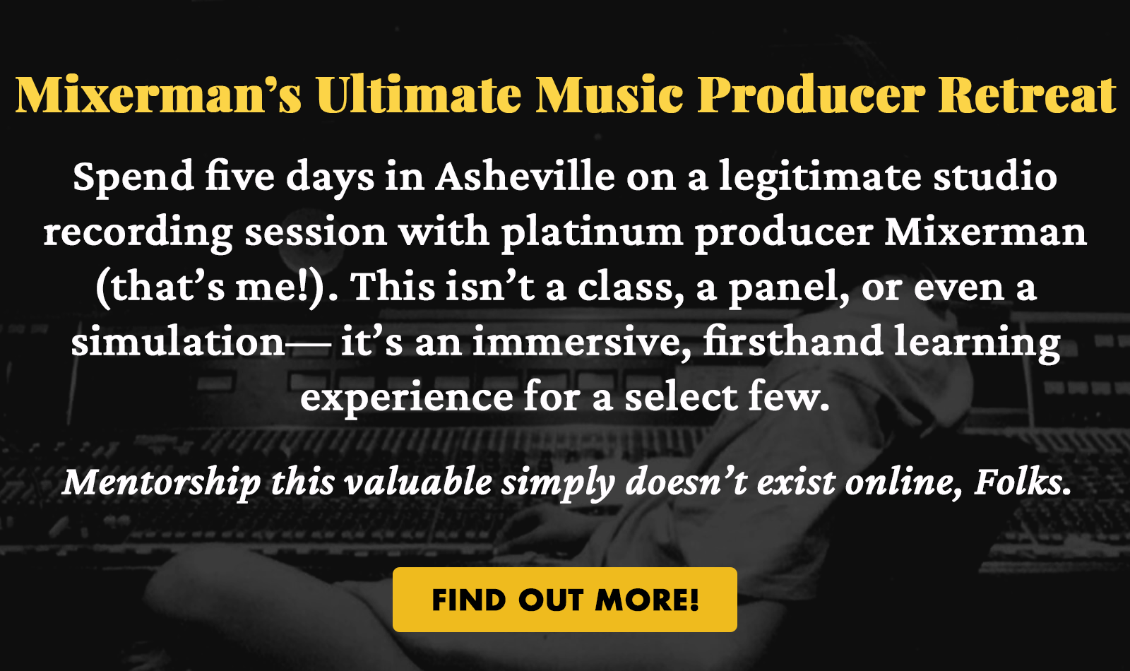 I’m also known as Mixerman—the pen name I use to write both instructive and satirical books on recording, mixing, and producing, all designed to help Creatives like you succeed.
